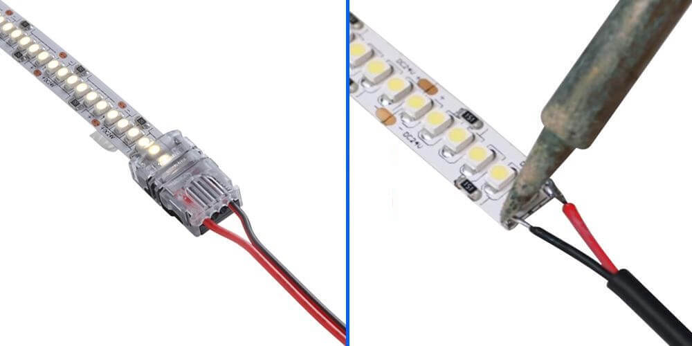 Un trucco molto utile utilizzato da installatori esperti è quello di chiudere il circuito della striscia collegando anche la parte terminale della striscia all'alimentatore. Questo ridurrà notevolmente il rischio di cali di tensione.