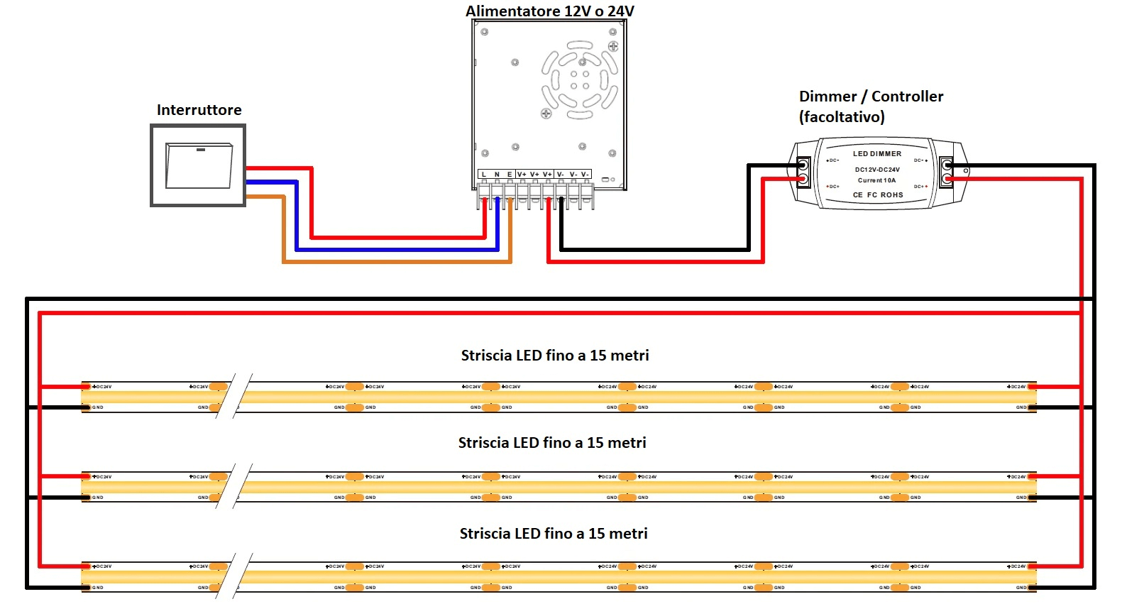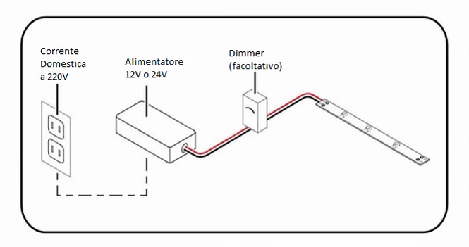 - Dimmerare la striscia acquistando un normale alimentatore non dimmerabile e installare il dimmer a 12V o 24V tra la striscia e l'alimentatore. Questa soluzione è la più diffusa per la sua semplicità.