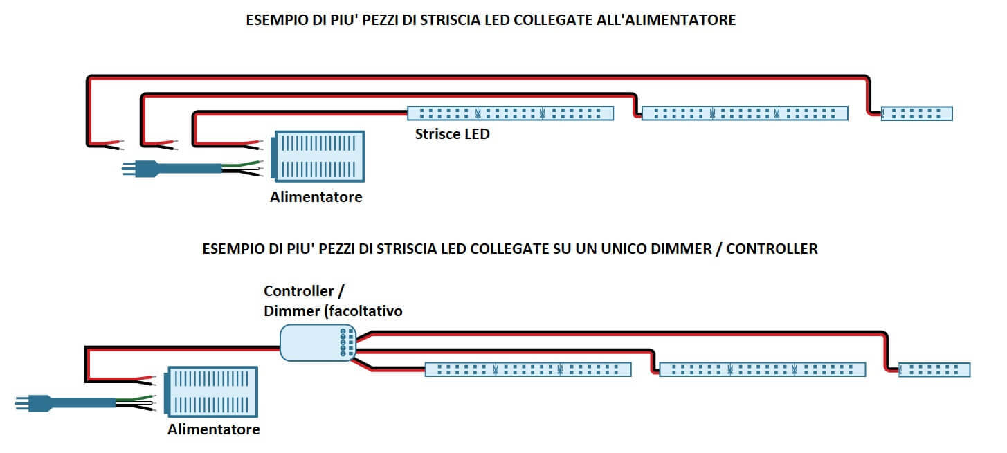 Per lunghezze superiori invece sarà necessario separare l'impianto installando più alimentatori magari controllandoli insieme tramite un unico interruttore di accensione o un unico telecomando per dimmer/controller, anche avendo più ricevitori dimmer e controller separati.