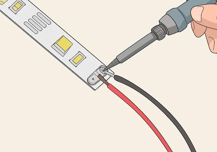 Per fissare i cavetti dell'alimentazione sulle parti di strisce LED tagliate potrai utilizzare dei connettori appositi o effettuare delle saldature con dello stagno sulle strisce LED, negli appositi punti.