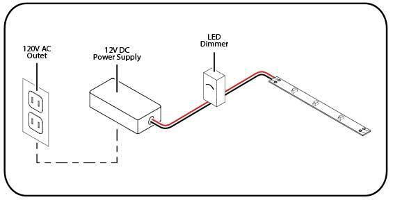 Tutte le nostre strisce LED a 12V e 24V hanno la possibilità di regolare l’intensità luminosa (dimmerazione). Possiamo farlo tramite uno dei nostri Dimmer che si collega in pochi secondi, come in questo schema: