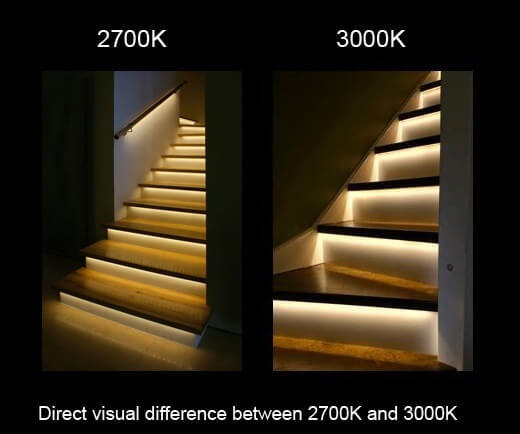 Se guardi le lampadine 2700K e 3000K una di fianco all'altra potrai facilmente notare la differenza tra le due. Tuttavia, se visiti amici in due case diverse (ma con stili di illuminazione simili), potresti non rendertene conto consapevolmente che il livello di illuminazione della prima casa è 2700K e il livello di illuminazione della seconda casa è 3000K. Solo un occhio esperto e attento si accorgerebbe della differenza.